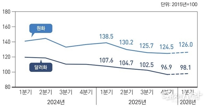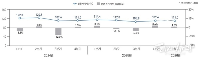해당 자료에 따르면 올해 1분기 사료용 곡물 수입단가지수(2015년=100, 원화 기준)는 126.0으로 예측되었습니다. 이는 직전 분기인 지난해 4분기 124.5보다 1.2% 상승한 수치입니다. 비록 1년 전인 지난해 1분기의 138.5와 비교하면 약 9.0% 낮은 수준이지만, 지난해 내내 이어졌던 하락 흐름이 일단락되었다는 점에서 시사하는 바가 큽니다.